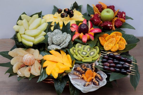 מרכיבים: מנגו, מלון, פלחי פינק ליידי מעוצבים, אננס, שיפודי ענבים, סברס, קיווי, תמר ממולא אגוזים, קובו, רימון, עם פמלה לבנה.