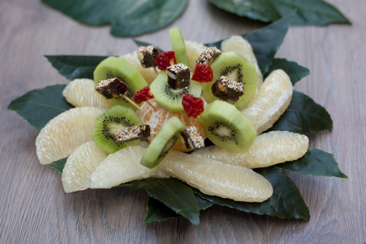 פלחי פמלה לבנה עם קיווי ומנדרינה בנגיעות תמרים בעיצוב יוקרתי.